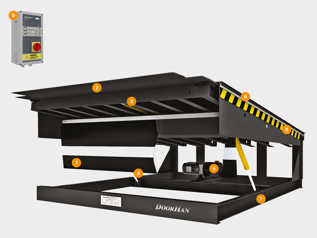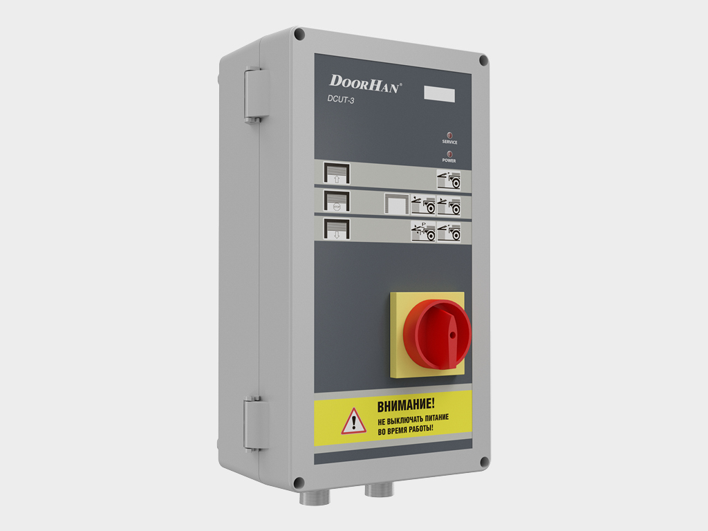 Блок управления DCUT-3 — комплексное устройство для управления элементами перегрузочного дока. Питание 380 В 3 фазы. Управление платформой осуществляется по удержанию кнопки. Автоматический возврат в парковочное положение по однократному нажатию кнопки AUTO. Блокировка платформы при закрытых воротах. Возможность подключения внешнего/внутреннего светофора. Освещение платформы. Индикатор необходимости технического обслуживания. Цифровой дисплей. Управление приводом ворот. Управление надувным герметизатором.