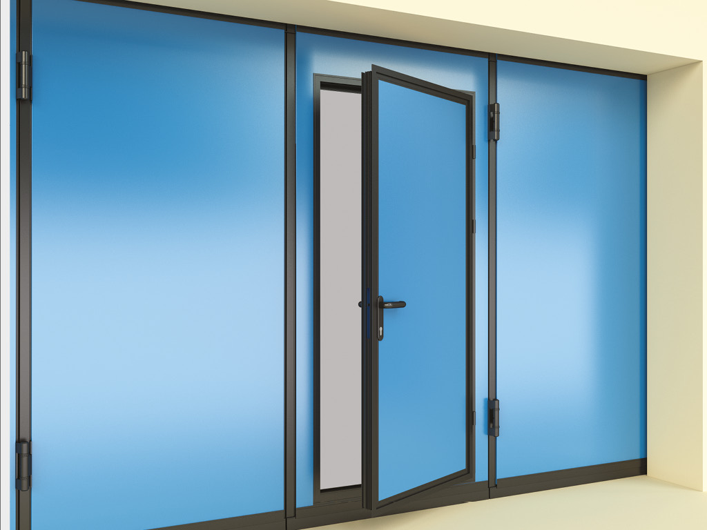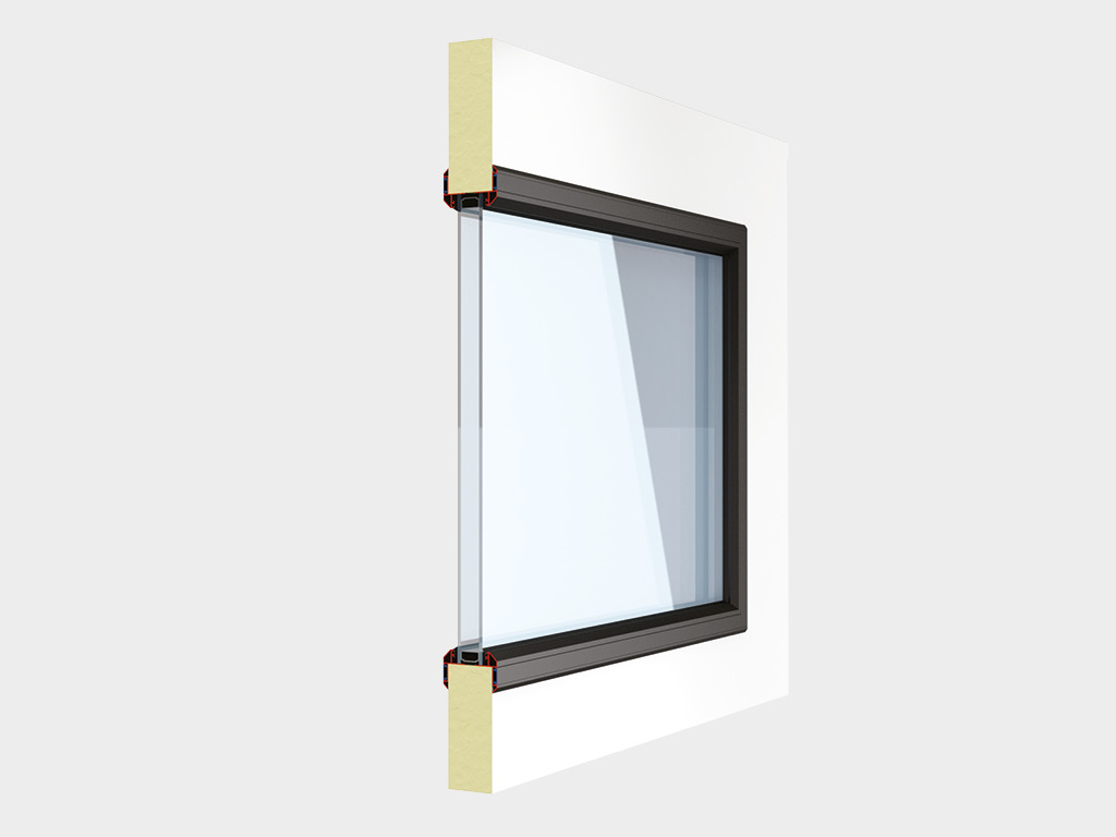 Окно в алюминиевой раме с заполнением прозрачным поликарбонатом толщиной 3 мм. Стандартный цвет рамы — RAL 9005 (черный).