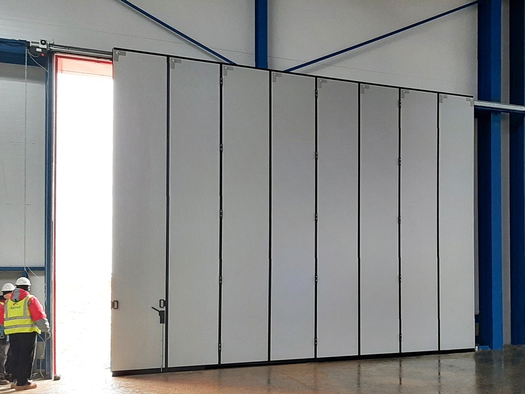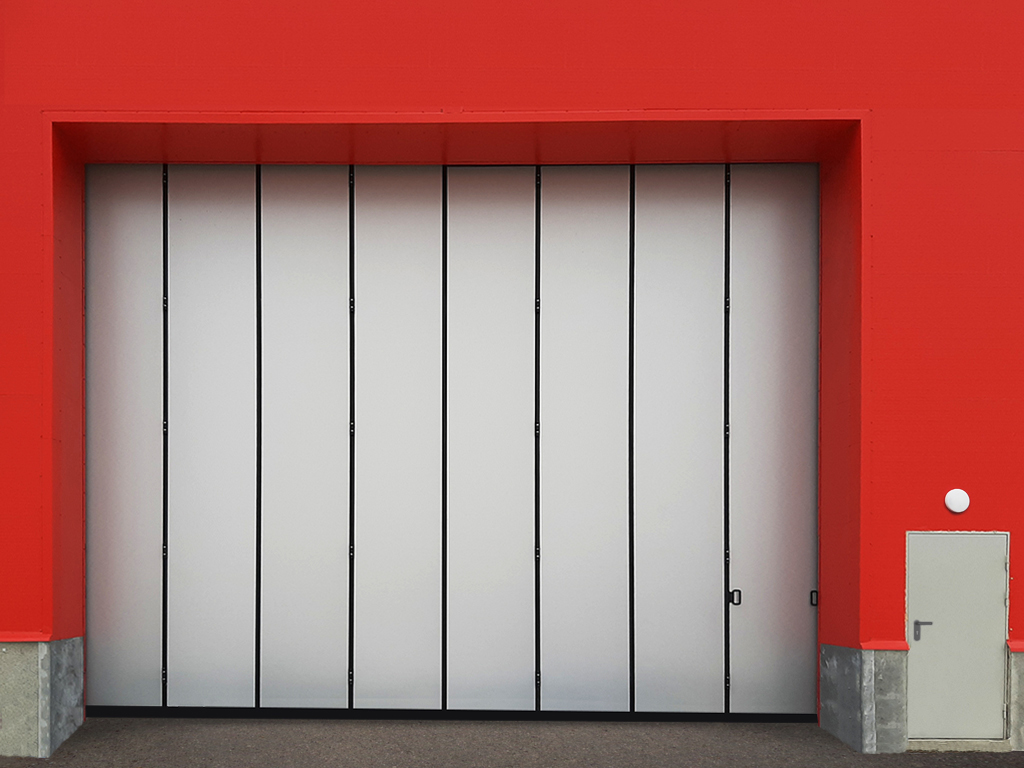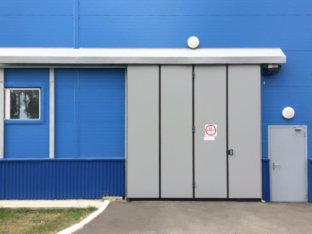 Автоматизированные промышленные откатные ворота без нижней направляющей. Проем 6 × 8 м. Монтаж внутри помещения. Вид внешней стороны